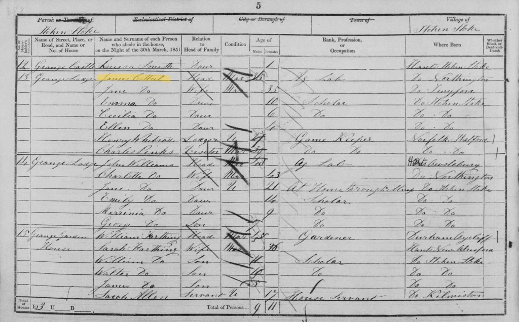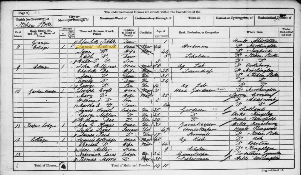 They appear on the 1841 Census living at Grange Lodge in Itchen Stoke, Alresford, which I believe was part of The Grange Estate. James and Jane’s age was recorded as 20 years, but I think they were closer to 24. James was an agricultural labourer. Living with them were their two daughters Mary, aged 2, and Emma, aged 10 months. Jane’s mother Fanny, aged 65, was also recorded at the address. The spelling of the surname appears to be Cotheil.