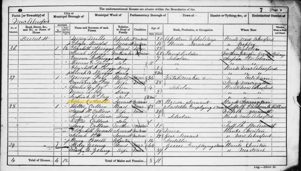Ellen, aged 18 and Cecilia, aged 15, were both in service to families living on Broad Street in New Alresford. Ellen was serving as a house servant for the Fay family and Cecilia was serving as a nursemaid for the Gladstone family.
