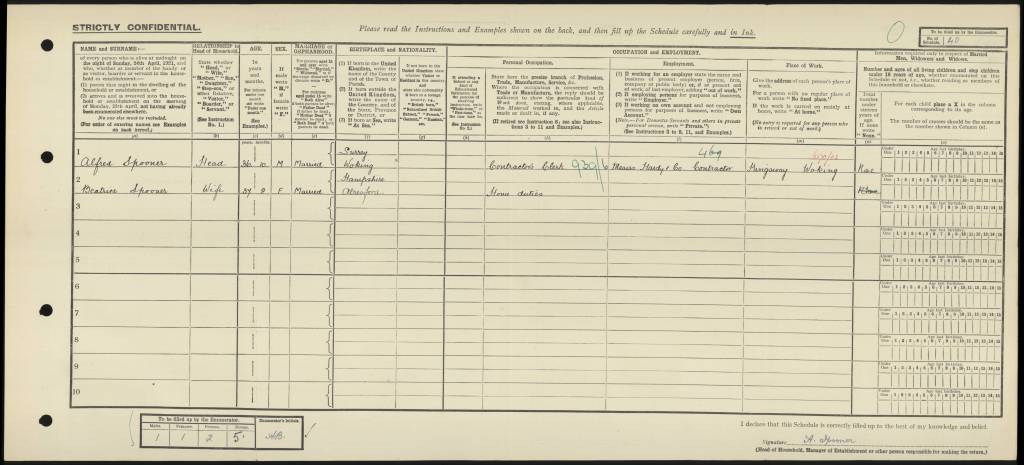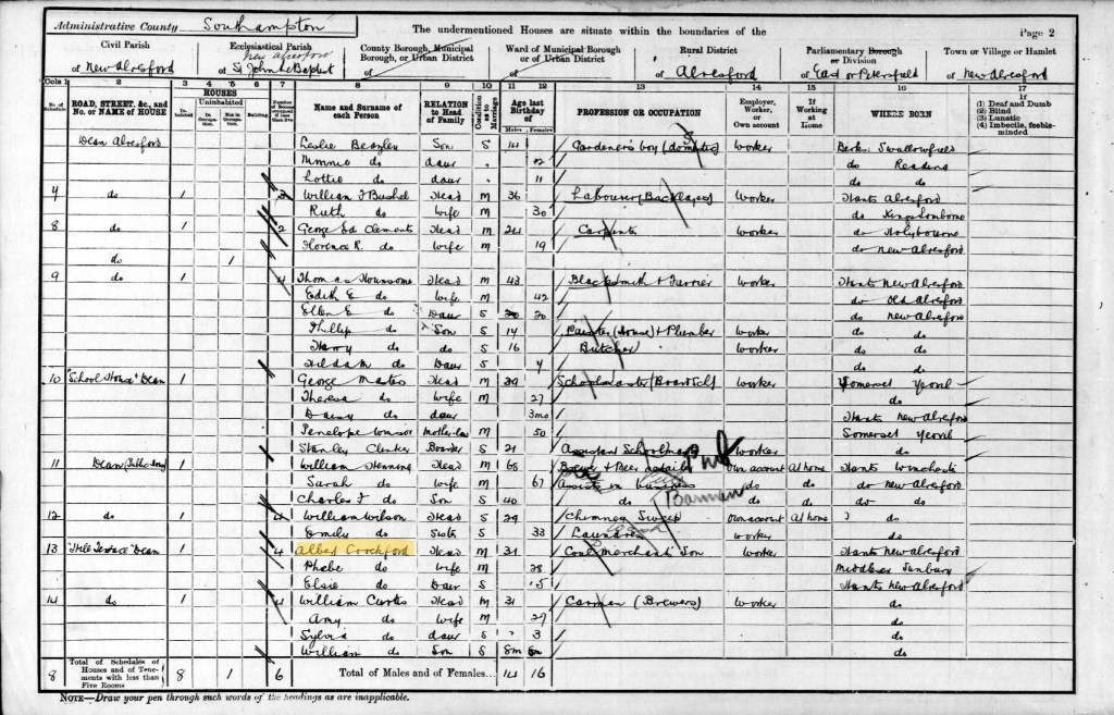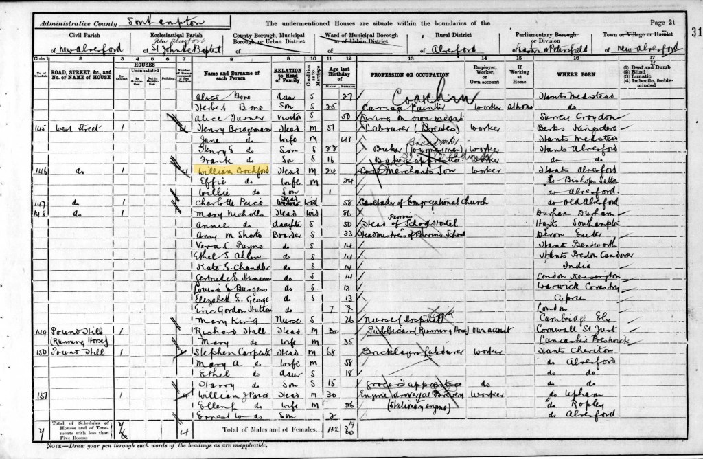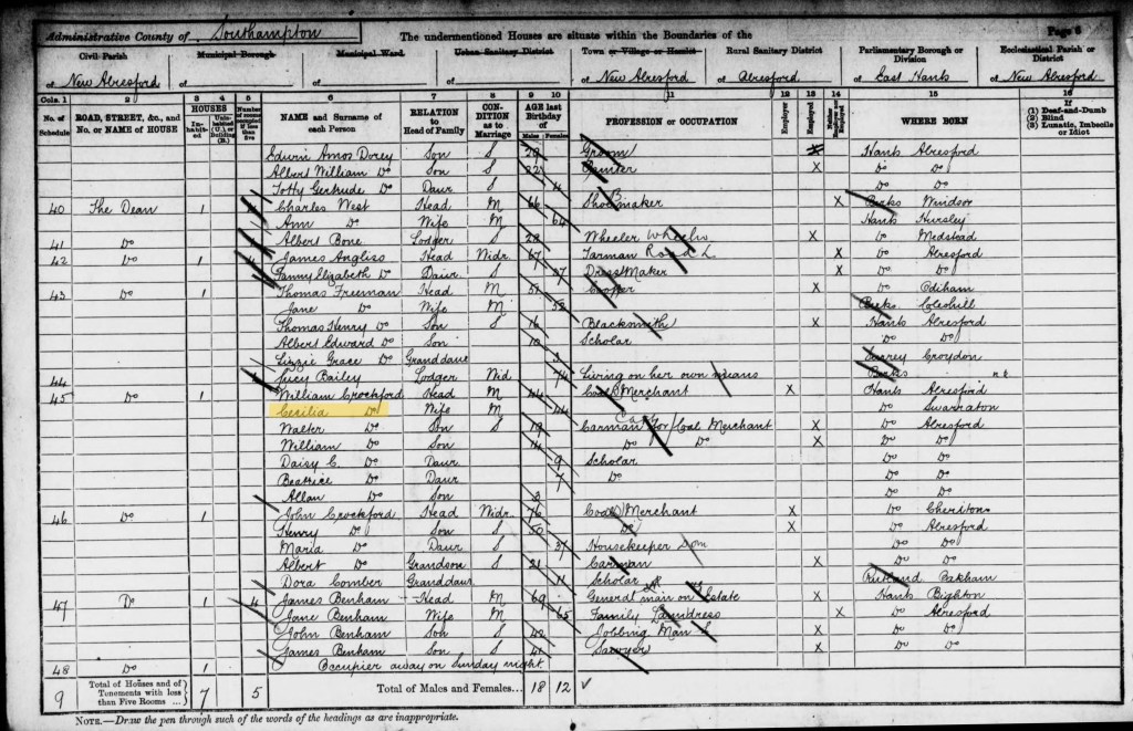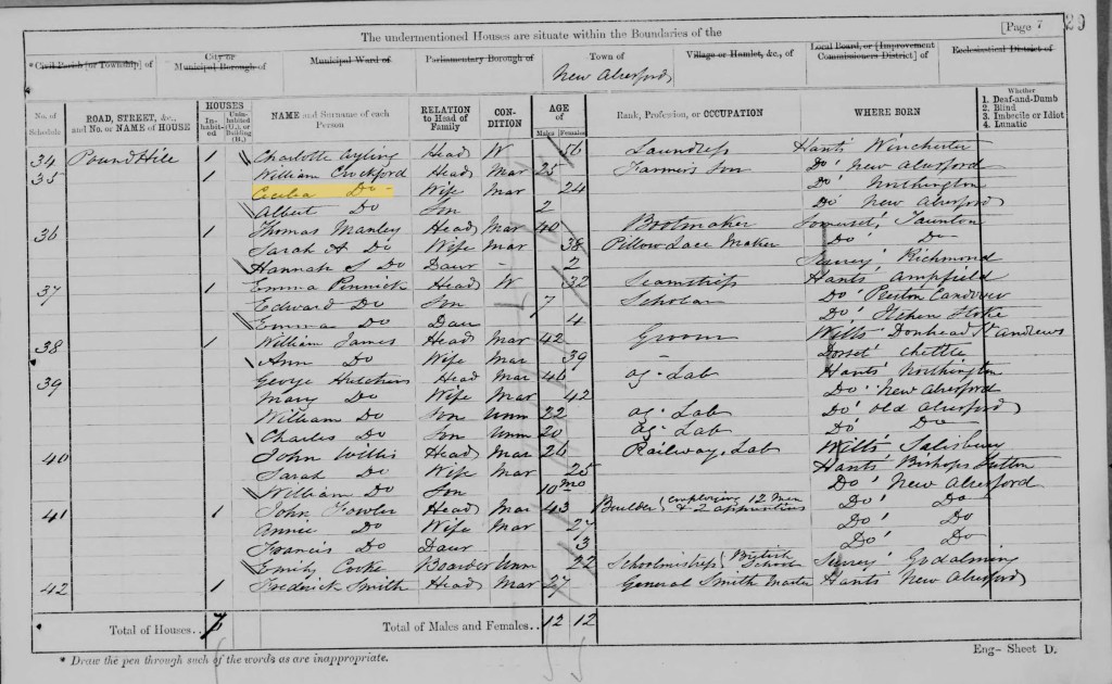 Cecilia, aged 24, was living with her husband William and their son Albert at Pound Hill, New Alresford. William was 25 years old and his occupation is listed as a farmer’s son. Their son Albert was 2.