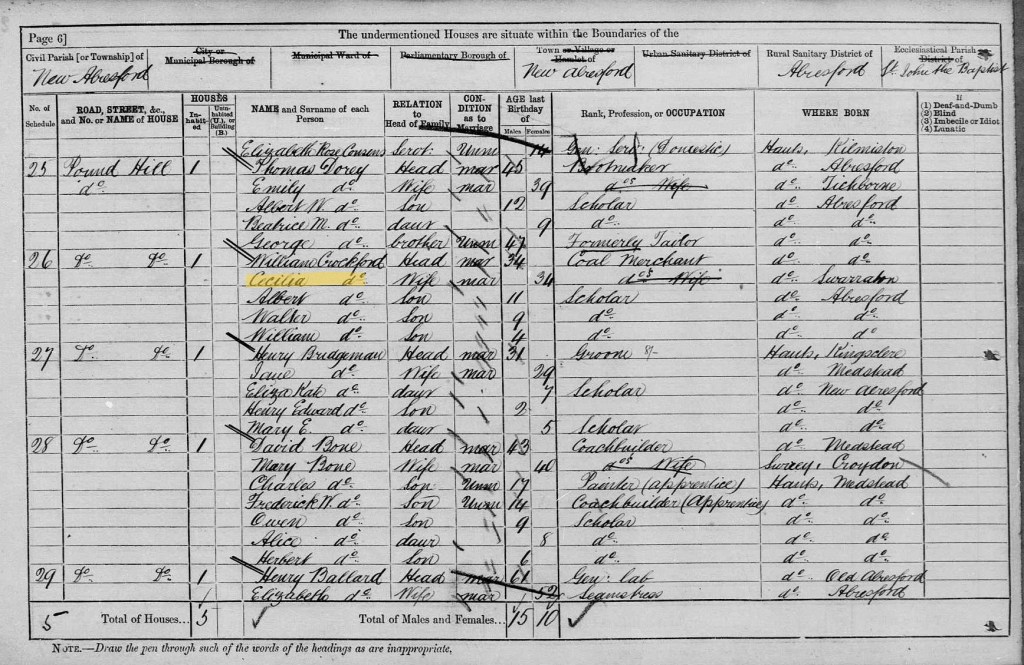 Cecilia married William Crockford in Alresford in 1869. William was born in Alresford in 1846. Before the next Census, they had one son named Albert in 1869. His birth was registered in New Alresford.