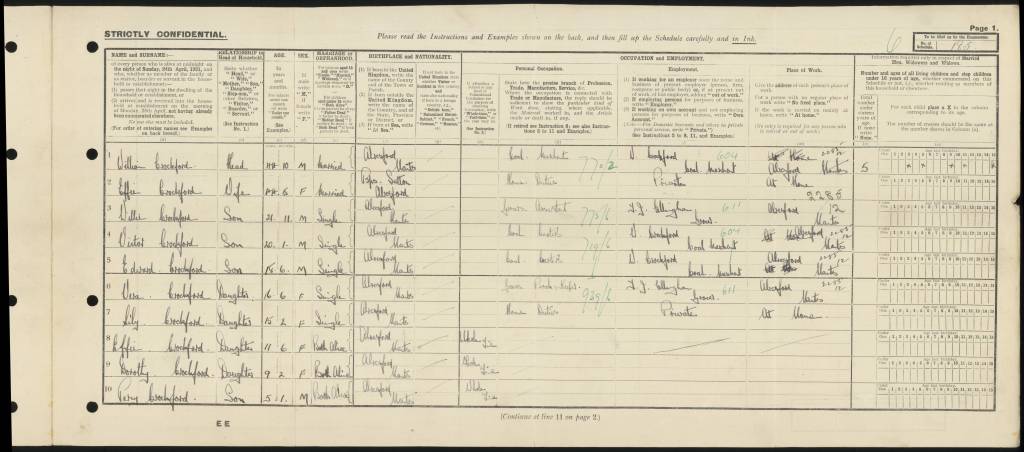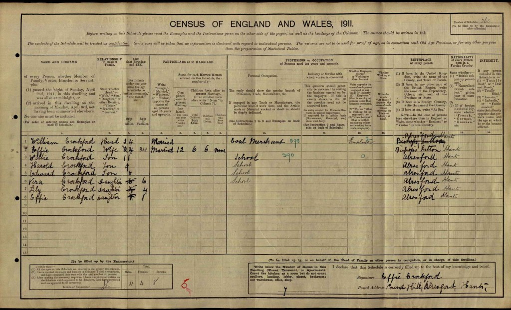 William and his family are recorded as residing at Hill Cottage on Pound Hill, Alresford. William was 44 years old and appears to have his own coal merchant business. His wife Effie was also 44. Living with them were their nine children: Willie, aged 21, working as a grocer’s assistant for J.J. Ellingham in Alresford; Harold (recorded as his middle name Victor), aged 20, working for his father as a coal carter; Edward, aged 18, also working for his father as a coal carter; Vera, aged 16, working as a book keeper for the same grocer as her brother Willie; Lily, aged 15, was recorded as working at home; Effie, aged 11; Dorothy, aged 9; Percy, aged 5; and Daisy, aged 3.