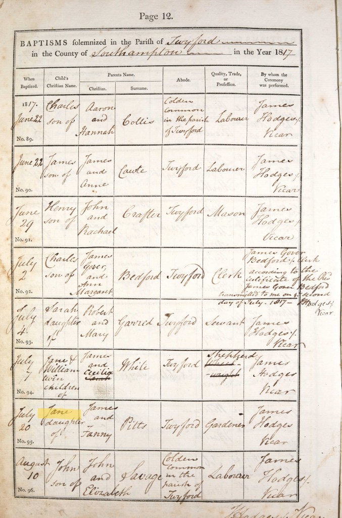 Jane Pitt, my 3rd great-grandmother, was born around 1817 in Twyford, Hampshire. Her parents were James and Frances (known as Fanny) Pitt, née Hammond. She was baptised on 20 July 1817 and at that time the family name was recorded as Pitts. Her father’s occupation was recorded as gardener.