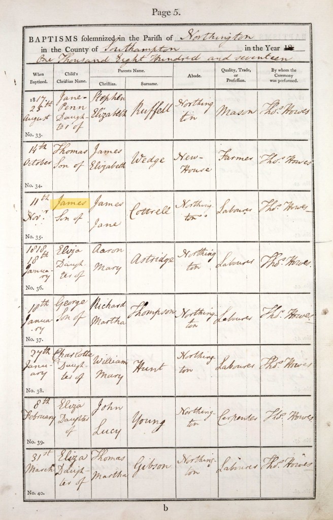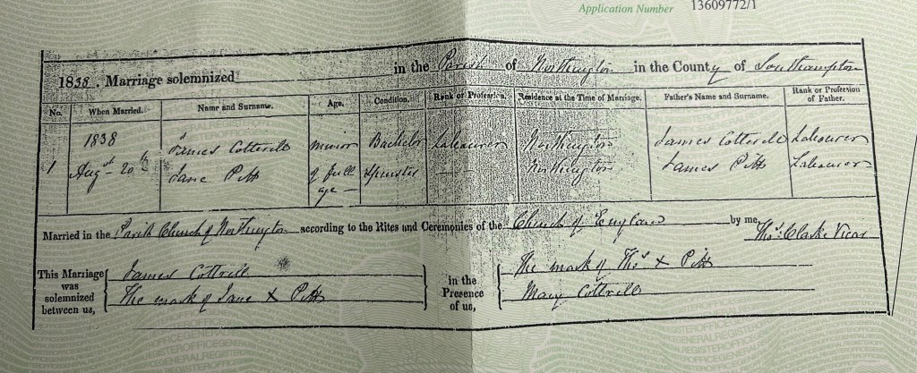 James Cottrell was my 3rd great-grandfather. The family name transitioned from Cottrell to Cotterell around the 1870s. He was born in 1817 and was baptised in Northington, Hampshire on 11 November that year. His parents were James and Jane. His father’s occupation was recorded as labourer.