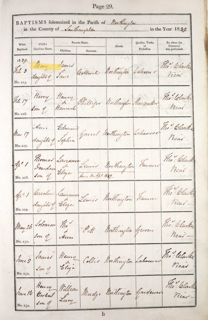 James and Jane had their first child, a daughter, in 1839. Mary was born in Alresford and was baptised on 3 February 1839. A second daughter Emma was born the following year, also in Alresford. Emma was baptised in Swarraton on 9 August 1840.