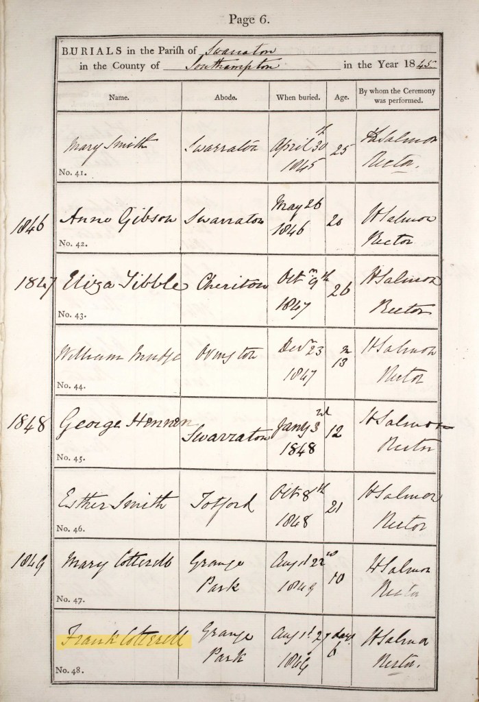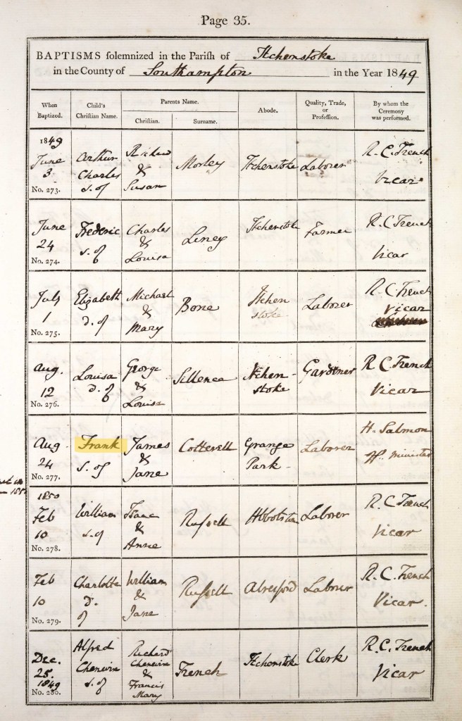 Their first son, Frank, was born in 1849. He was born in Alresford and registered as Cottril, baptised on 24 August. Sadly, he died when he was 7 days old and was buried a few days after his baptism on 27 August. On the page in the burial book there is a record of a Mary Cotterell being buried shortly before Frank on 22 August. I think her age has been recorded as 10 weeks or months. I’m not sure who she is currently.
