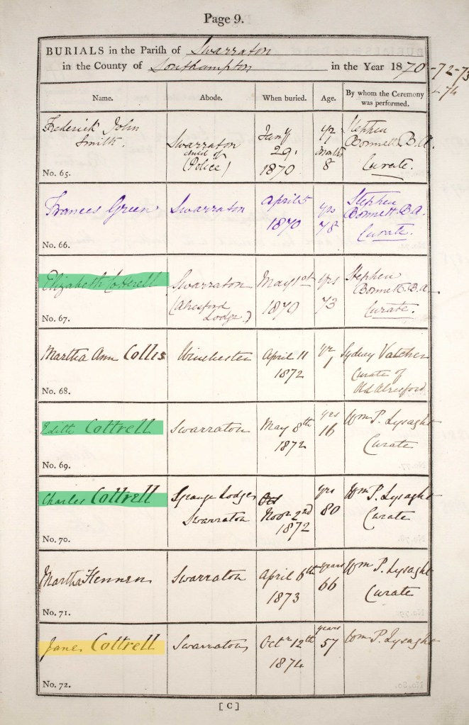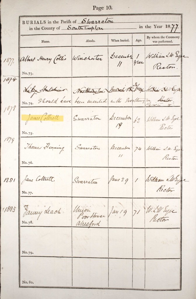 At first, I had thought that neither James nor Jane were buried at the local church in Northington where numerous other family members are interred as neither are mentioned on the list of burials available on the Church website. However, I have since found a copy of the Church burial book on Ancestry (and later found Jane listed also), which shows that James was buried by Rector William Eyre three days after his death on 19 December. There is also a Jane Cottrell listed on the same page who was buried in 1881. This Jane was only a year old when she died. She was James’ granddaughter – daughter of Walter and Elizabeth, my second great-grandparents. Jane was born after James’ death in 1880.
