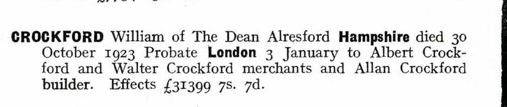 Cecilia and William’s eldest son Albert died aged 73 on 29 June 1942. He was still living at The Dean in Alresford when he died. His effects went to National Provincial Bank Limited – perhaps this means he did not have a last will and testament?