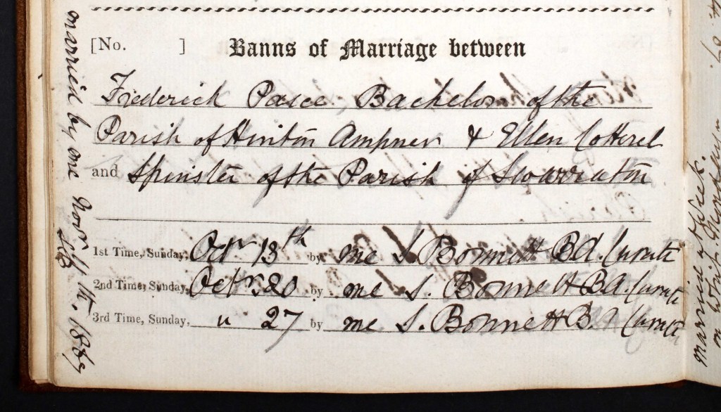 In 1867, Ellen married Frederick James Paice in Alresford. He was two years younger than Ellen, born in 1846 in Alresford. The Marriage Banns give the day of their wedding as 11 November. They had a son William Frederick, born in 1868 in Alresford. He was baptised on 1 March that year. Ellen sadly died at just 27 years old in 1871. She was buried on 10 January in New Alresford. The record gives her age as 25. I think that Frederick remarried in 1891 to Rosina Tyler.