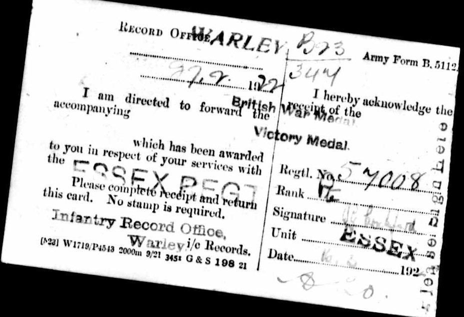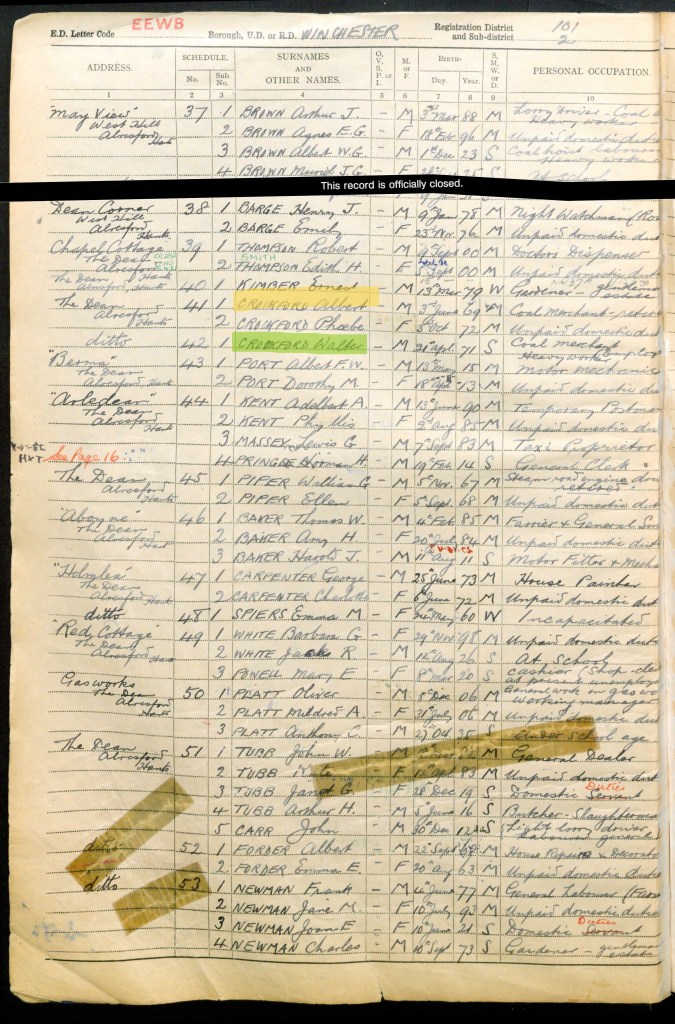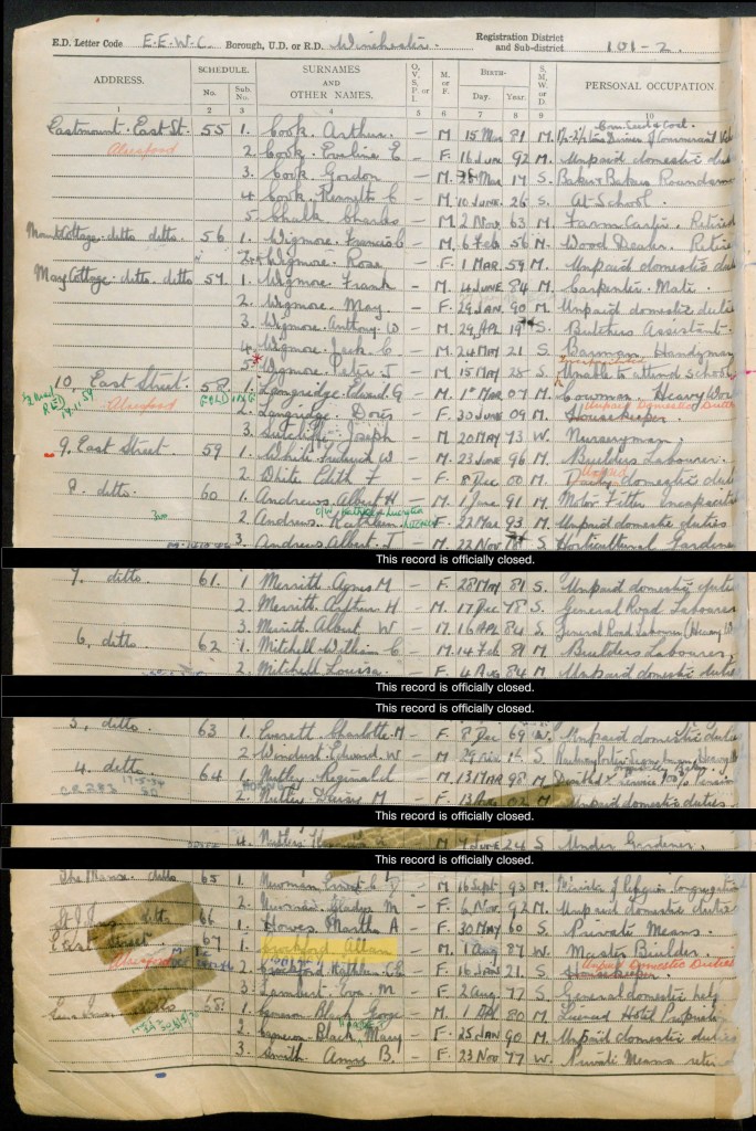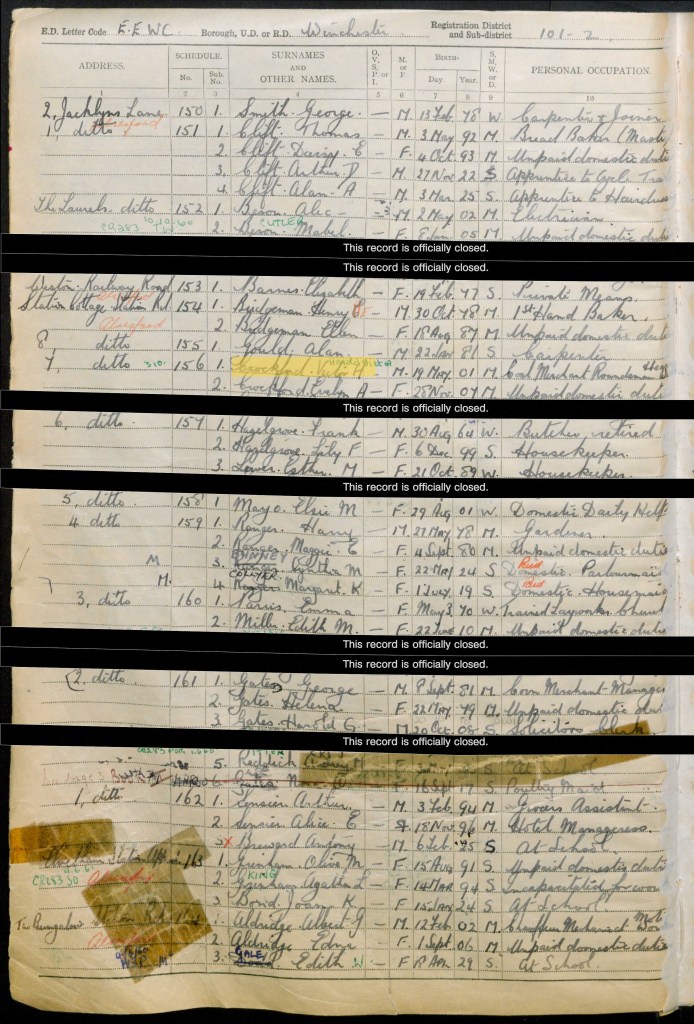 William and Effie’s eldest son Willie had enlisted in the Army in 1918 when he was 18. The record is somewhat faded but it does confirm that he was awarded the British War and Victory medals for his service. In 1925, he married Elsie Mary Carpenter in Alresford. Elsie was born in 1904 in Alresford. I believe they had three children: Brenda C, born 1925 in Alresford; Betty M, born 1930 in Alresford; and Bryan W, born 1939 in Winchester. At the time of the Register, they were living at Bishop’s Sutton Stores in Winchester. Willie’s date of birth was recorded as 9 July 1899, and Elsie’s was 6 March 1904. Willie’s occupation was shopkeeper. There are three closed records, presumably relating to his children. There is also mention of Margaret Aphleton (sp) and another closed record at the address but I am not sure who this is.