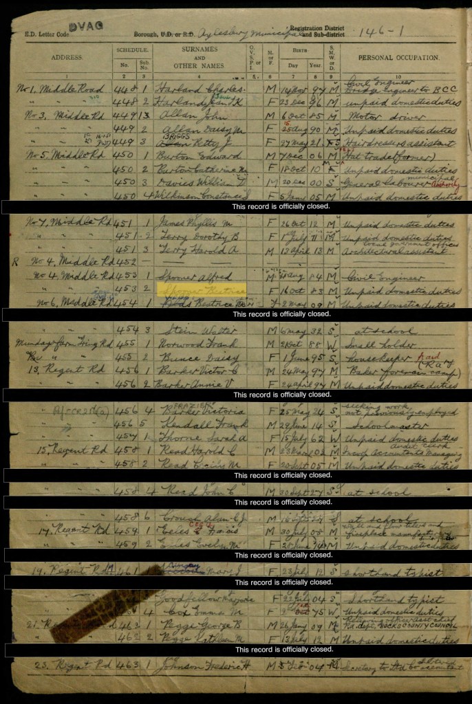 William and Effie’s second child Harold married Evelyn Annie Green in 1933 in Steyning, Sussex. Evelyn was born in 1907 in Steyning. I believe they had one child: Ronald E, born 1935 in Winchester. At the time of the Register, they were living at 7 Station Cottage, Station Road in Alresford. Victor’s date of birth was recorded as 19 May 1901 and Evelyn’s was 28 November 1907. Victor’s occupation was coal merchant. There is one closed record which I assume to be Ronald’s.