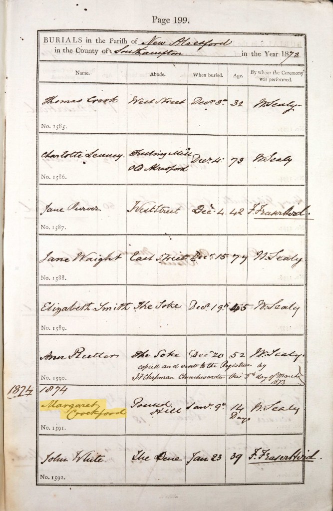 Cecilia and William had a second son in 1871. His name was Walter and he was born in Alresford. They then welcomed a daughter called Margaret at the end of 1873 (also in Alresford). She sadly died at two weeks old and was buried on 9 January 1874.