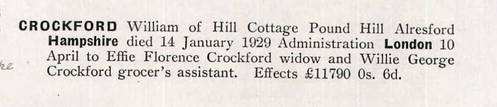 William, Cecilia and William’s fourth child, had passed away on 14 January 1929 aged 52. Probate of his estate confirms that he left a sum of £11,790 0s 6d to his widow Effie and his eldest son Willie.