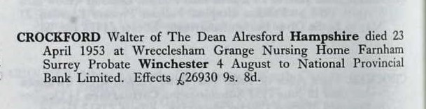 Cecilia and William’s son Walter died at 83 years of age on 23 April 1953 in Alresford. Like his older brother Albert, his effects went to National Provincial Bank. His residential address was also The Dean but he actually died at a nursing home in Farnham, Surrey.