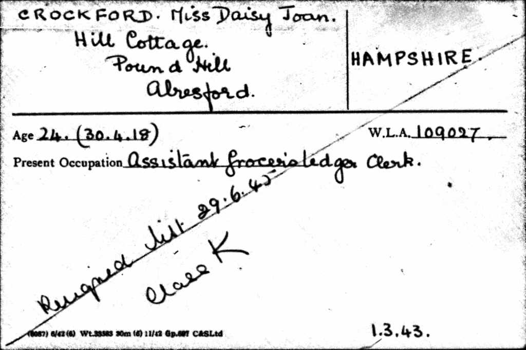 Daisy married Alan V Stevens in 1952 in Winchester. Prior to this, there is a record of her serving in the Women’s Land Army from 1 March 1943 to 29 June 1945. She died aged 60 on 8 February 1979. I haven’t found any records of her husband Alan.