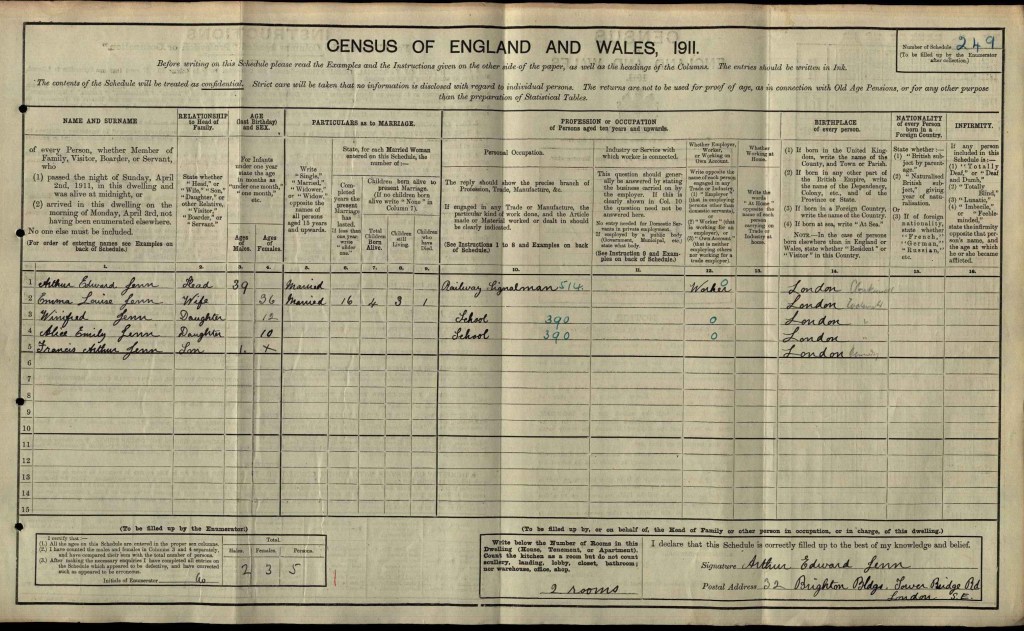 Win and her family had moved to 32 Brighton Buildings on Tower Bridge Road, London. She was 12 and at school. Her father Arthur was 39 years old and his occupation was a railway signalman. Her mother Emma was 36. Arthur and Emma had been married for 16 years and had four children together, one of whom had died (Arthur junior). Win’s sister Alice was 10 and also at school. She also now had a younger brother, Francis Arthur (known as Frank), who had been born in 1910 in Bermondsey. He was one year old when the Census was recorded.
