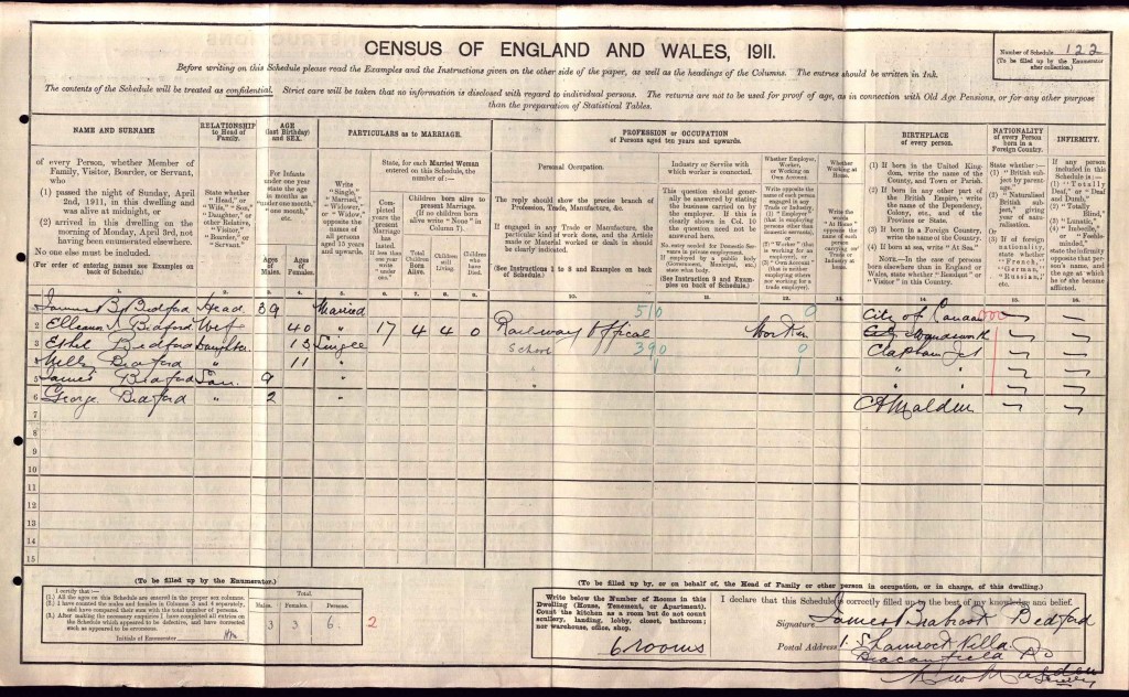 James Burgess Bedford, known as Jim, was my Grandpa’s father (my Mum’s father). He was born on 17 June 1902 at 6 Mossbury Road in Battersea, London. His parent’s were James and Eleanor Bedford, née Burgess. His father’s occupation was a railway ticket examiner.