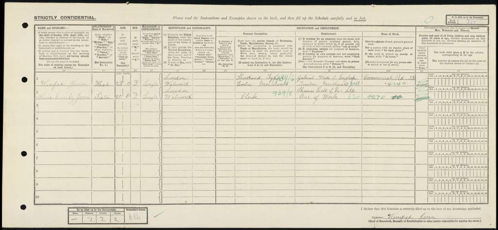 Win was still living at 32 Brighton Buildings on Tower Bridge Road, Bermondsey. However, her parents Arthur and Emma, and her brother Francis, had moved to 28 Brighton Buildings. Win, aged 23, was living with her sister Alice, aged 20. Alice was recorded as being out of work; her previous employer was Thomas Scott & Co, an iron and steel merchants. Their father Arthur worked for the same company as a warehouseman.