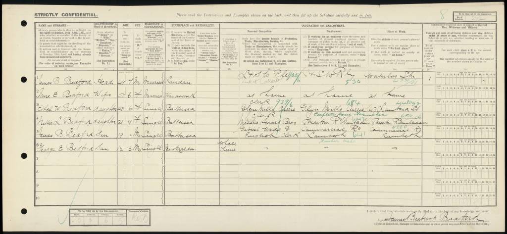 The handwriting (sorry 2x great-grandfather James!) is not easy to decipher. Jim was 19 years old and working as a clerk for Gabriel, Wade & English, a timber works on Commercial Road in Lambeth. Jim’s father was 49 years old, and I believe a railway ticket collector. His mother, listed as Jane (her middle name) was 50. His two older siblings were also working: Ethel, aged 26, was working as a clerk for Glyn or Glenn Mills; and Nellie, aged 21, was also a clerk but I cannot decipher the name of the company she worked for. Jim’s younger sibling George was 12 and at school.