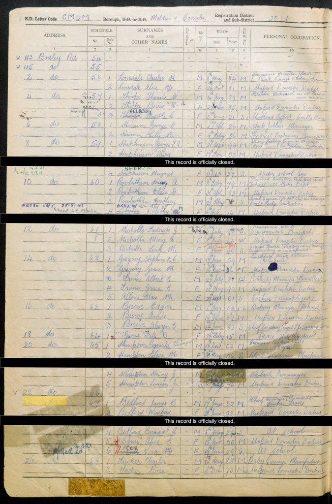 Also living with Jim and Win is Win’s sister Alice and Alice’s daughter Vera. Alice had married Frederick William Sams on 19 September 1928 at St. Mary Magdalene Church in Bermondsey. They had their daughter Vera Muriel on 19 June 1929 in Lambeth. Frederick, listed as Fred, is recorded as the sole occupier of 64 Dassett Road in Lambeth. His occupation was listed as a police constable in the Metropolitan Police. It’s possible that Alice and Vera were either visiting Jim and Win (though I am not sure if visitors were recorded on the Register as it was to be used for the issuing of ration books and ID cards), or they had gone to live there to be away from the centre of London where bombing was more likely. That said, New Malden was one of the first places in London to be bombed on 16 August 1940.