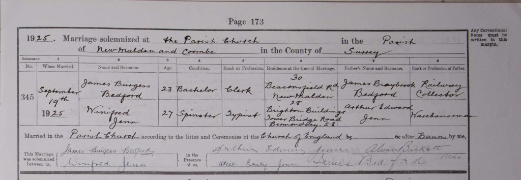 Jim, aged 23, and Win, aged 27, married at Christ Church, New Malden on 19 September 1925. Reverend Alvan Birkett, the third vicar of Christ Church, presided at the ceremony. He was vicar at the church between 1921 and 1935. Jim and Win’s occupations and addresses were the same as they had been at the time of the 1921 Census. Jim’s father James was a railway collector and bore witness to the marriage, as did Win’s father Arthur, who was a warehouseman. Win’s sister Alice was also a witness.