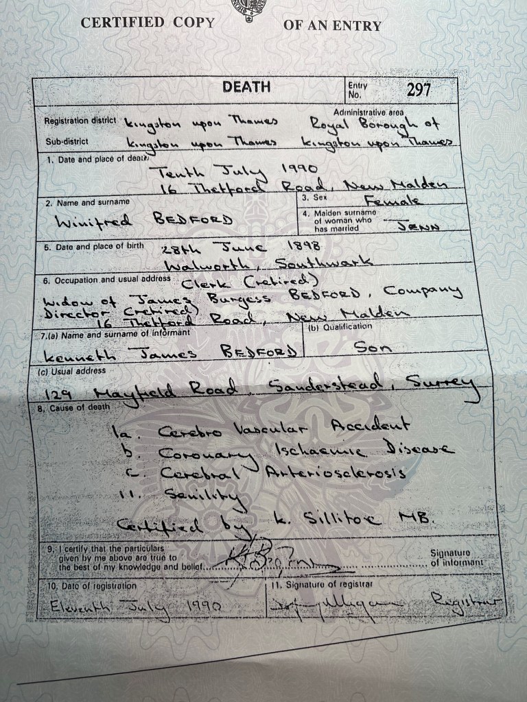 My great-grandmother died seven years later on 10 July 1990, aged 92. She passed away at a nursing home on Thetford Road in New Malden of a cerebrovascular accident (loss of blood flow to part of the brain), coronary ischaemic disease, cerebral arteriosclerosis (a hardening of the arteries in the brain), and senility.