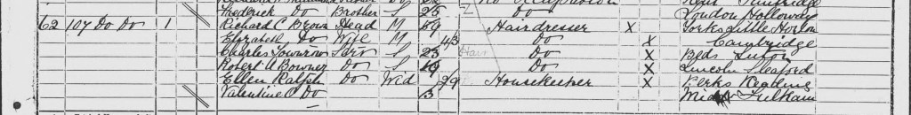 When the 1891 Census was taken on 5th April, Valentine, aged 3, was living with his mother on the High Street in Putney with Richard and Elizabeth Brown. Helena (incorrectly transcribed as Ellen) was their housekeeper, and the Browns were hairdressers.