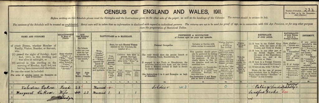 On 2nd April 1911, when the Census was taken, Valentine and Margaret are living off of Sloane Square in London. Valentine’s occupation is listed as Soldier, having enlisted in the Grenadier Guards on 24th January 1905. His service number was 11994.