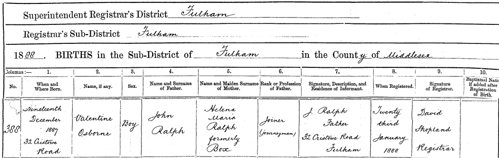 Valentine Osborne Ralph was born on 19th December 1887 in Fulham. His father was John Ralph and his mother was Helena Maria, née Fulbrook. On Valentine’s birth certificate, her maiden name is given as Box. Helena had been born in 1861, and her father was unknown. The name Box comes from Helena’s mother’s marriage to Henry Box in 1865.