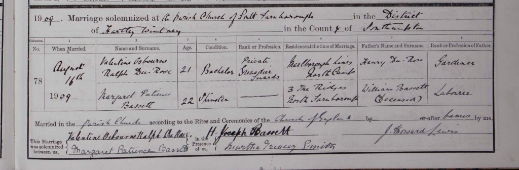 Valentine married my great grandmother Margaret Patience Bassett on 16th August 1909 in Hampshire. Valentine is now using his step-father’s surname Du Rose (and his birth surname Ralph as a middle name) and lists Henry as his father on the marriage certificate. Valentine never knew his birth father.
