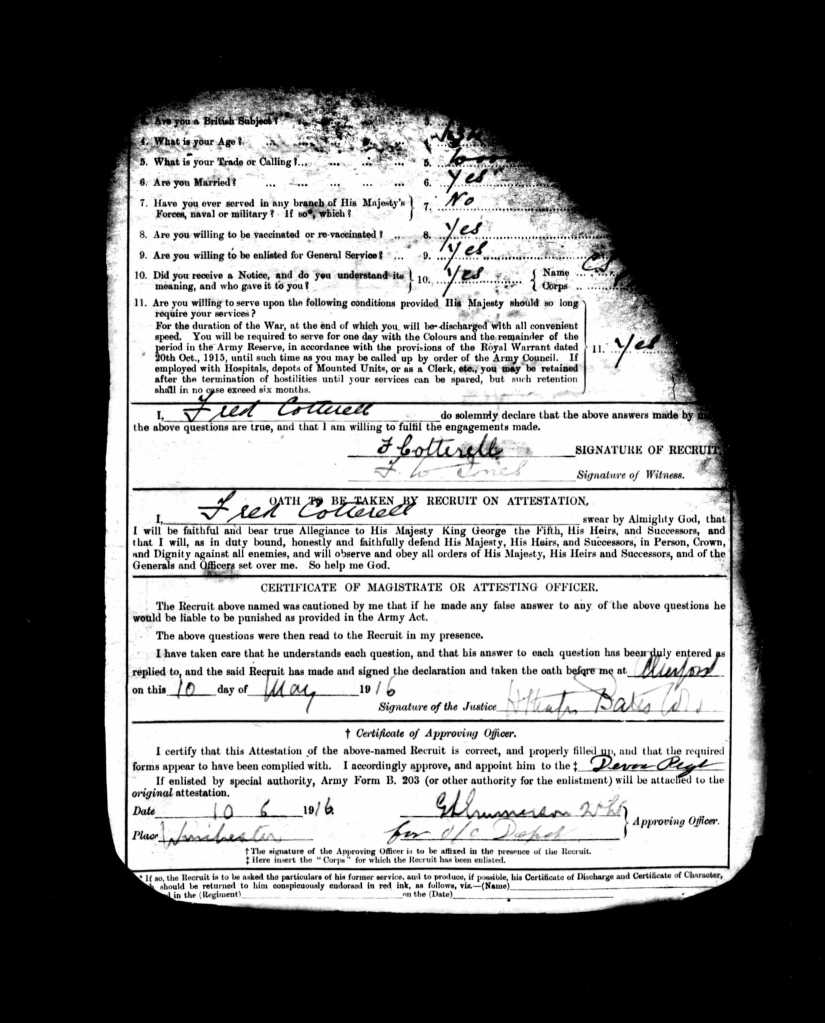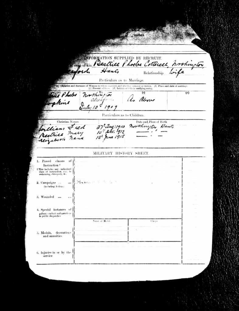 In May 1916, Fred, aged 34, enlisted in the Machine Gun Corps of the Army (service number 72493). He served in France between 25 October 1916 and 16 January 1919. His attestation papers give the date of his marriage to Beatrice and the dates of birth of his eldest three children (William was born 27 August 1910; Beatrice on 10 December 1912; and the form says that Elizabeth was born 15 June 1915, however, her birth was registered in 1914).