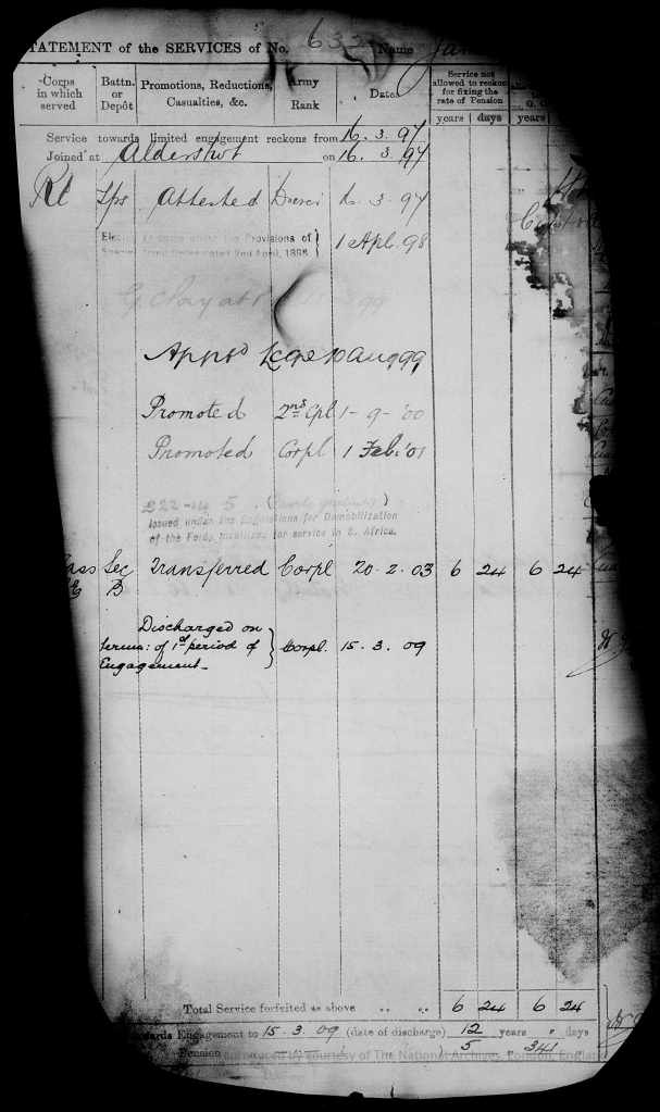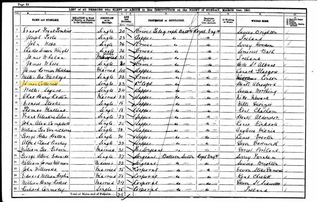 Walter and Elizabeth’s eldest child James was recorded as living at Aldershot barracks when the 1901 Census was taken. He was aged 23 and was a 2nd Corporal.