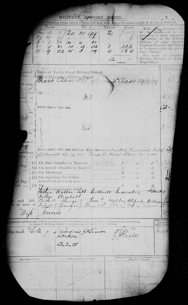 James married Jennie Cole on 23 March 1905 in London. Jennie was born in 1879 in London. James was discharged from the Royal Engineers in 1909, having been promoted to Corporal (on 1 February 1901) and had served in South Africa.