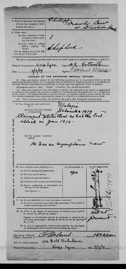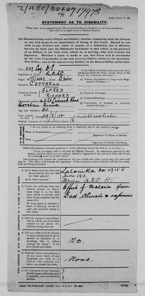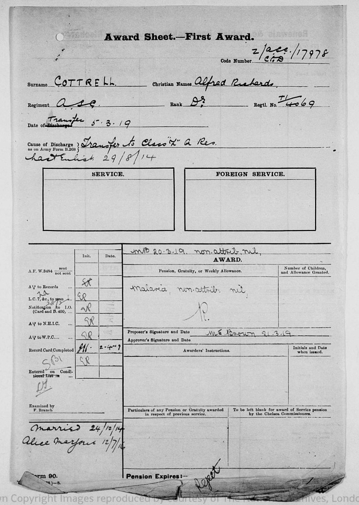 Alfred had enlisted in the Army on 29 August 1914, just prior to his wedding (as it was a Christmas Eve wedding, perhaps he was home on leave for the festive period?). He was a driver for the Royal Army Service Corps (service number 4069), the unit responsible for keeping the British Army supplied with provisions (excluding weaponry and ammunition). While I have not tracked down his attestation papers, I have found his discharge documents which show that Alfred was discharged in February 1919 as he had contracted Malaria in 1917 and suffered frequent attacks. At the time of his discharge, he was living at 42 St. Leonard Road in Horsham. The papers gave the date of his marriage and the date that his eldest daughter Alice was born.