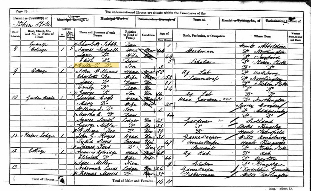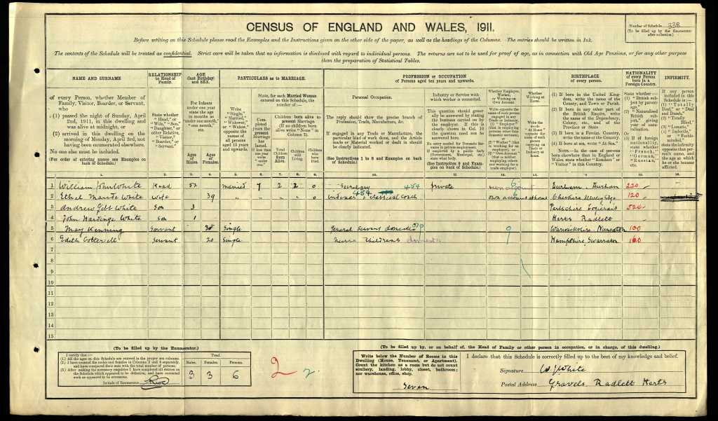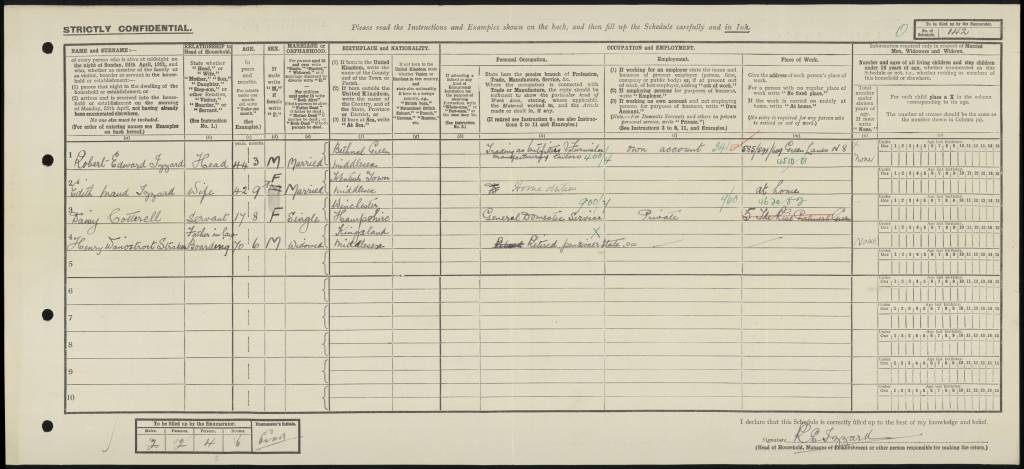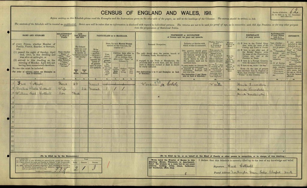 Fred, his wife Beatrice and their son William were living at The Lodge on the Grange Park estate. Fred was 29 years old and a woodman, Beatrice was 24 years old, and William was 7 months.