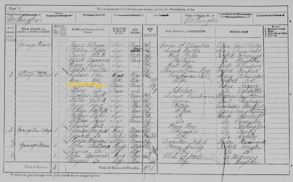 Elizabeth, aged 8 (the Census gives her age as 9 but the record was taken a few days before her 9th birthday), is living with her family at New Road in Chelsea. Her father Richard was 48 years old and a domestic coachman, her mother Ann was 50 and a laundress. Richard and Ann had four further children at home with them: George (aged 13, a domestic servant), twins Charles and Jesse (aged 11, scholars), and William (aged 7, a scholar). Elizabeth was also recorded as a scholar. Also living with the family were three lodgers: W Downe (aged 19, clerk to a baker), Samuel Hitchin (aged 40, occupation not legible), and Charles Killick (aged 24, a domestic servant).