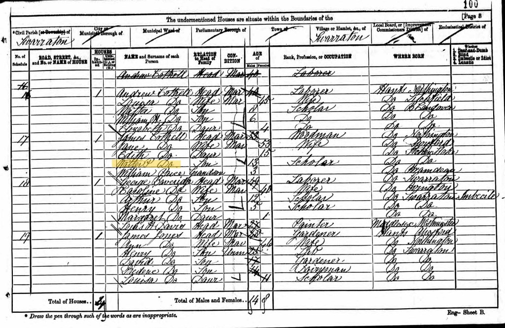 On 2 April 1871 the next Census was taken. The address is not clear, but Walter was still living with his family in the area of Grange Park. Walter was 13 years old and a scholar. His parents James and Jane were 53, and his father’s occupation was still woodman. Walter’s older sister Edith was also with them, now aged 15. There is no occupation recorded for her. Also living with them is William, aged 3, recorded as James and Jane’s grandson. This is not William my great-grandfather.