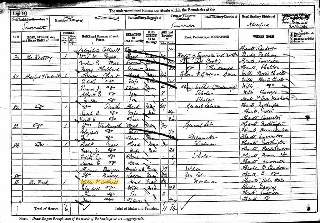 On 3 April 1881, the next Census was taken. Walter, aged 23, and his young family are recorded as living in ‘the Park’ in Swarraton (I have assumed this means the Grange Park estate). His occupation was recorded as woodman. Elizabeth was now 28. Their children, James and Jane, were 2 years and 10 months old respectively.