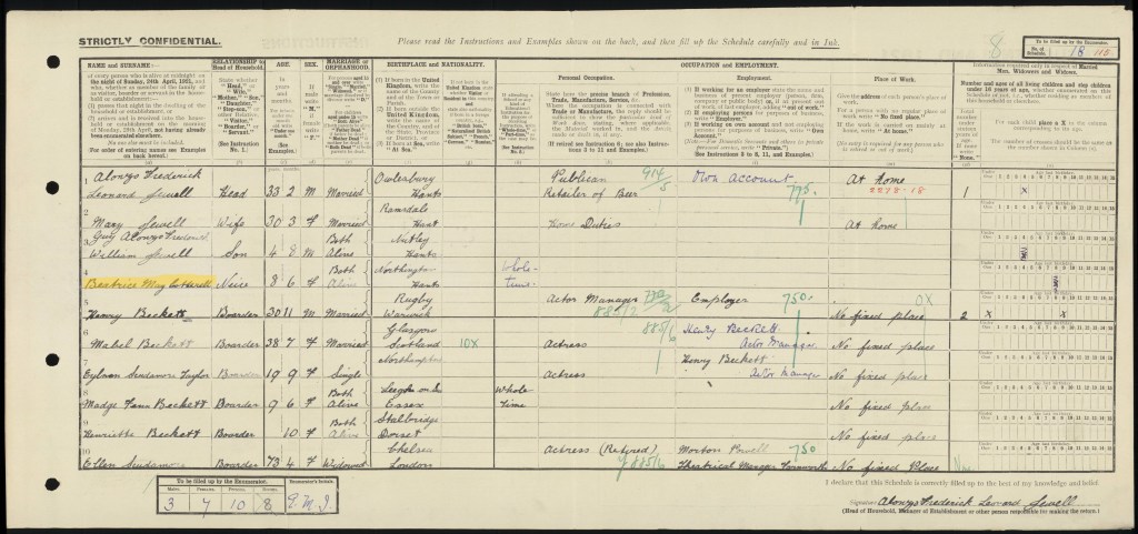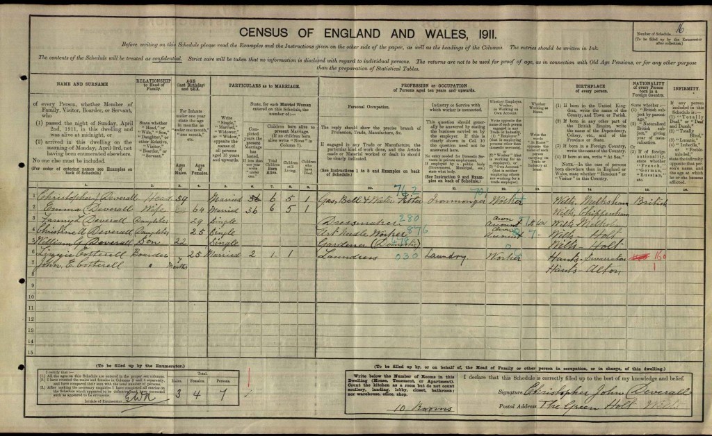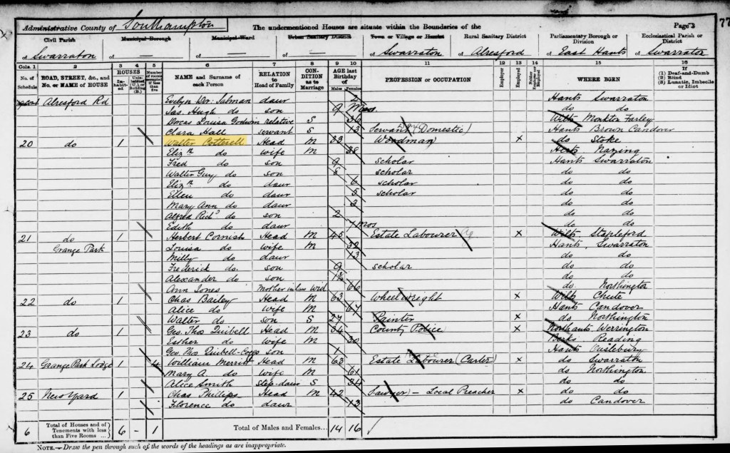 Fred and Beatrice, aged 40 and 34 respectively, remained in Northington. They lived at North Lodge with three of their children; William, aged 10; Elizabeth, aged 7 (recorded as Nana Elizabeth. Nana being her registered middle name); and Maud, aged 2 months. Fred was a woodman employed by Lord Ashburton, the owner of the Grange Park estate. Their eldest daughter Beatrice was recorded as the niece of Alonzo and Mary Jewell at The Crown Inn pub in Axford, Basingstoke. She was 8 years old and recorded as being at school. I wonder if the fact that she has been recorded as niece is incorrect; she does have an aunt called Mary, but what has been recorded on the Census does not correlate with her aunt’s information.