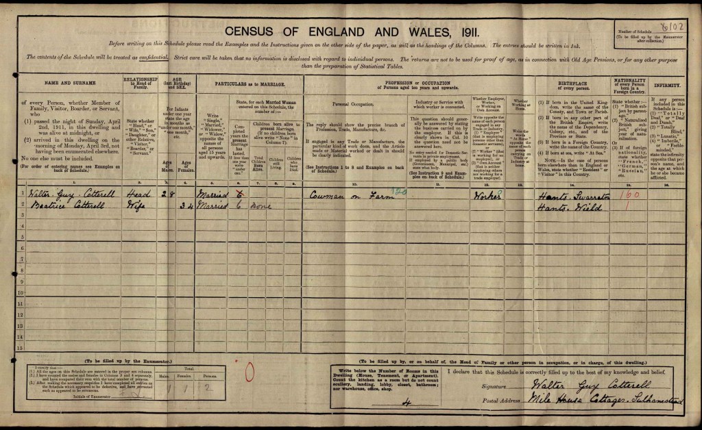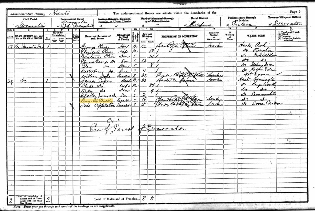 Walter Guy was recorded as Guy Cotterell and lived and worked at New Swarraton Farm for the 1901 Census. He was 18 and working as a yardman. He lived as a boarder with James and Alice Soper and their two children. Walter was one of two boarders.