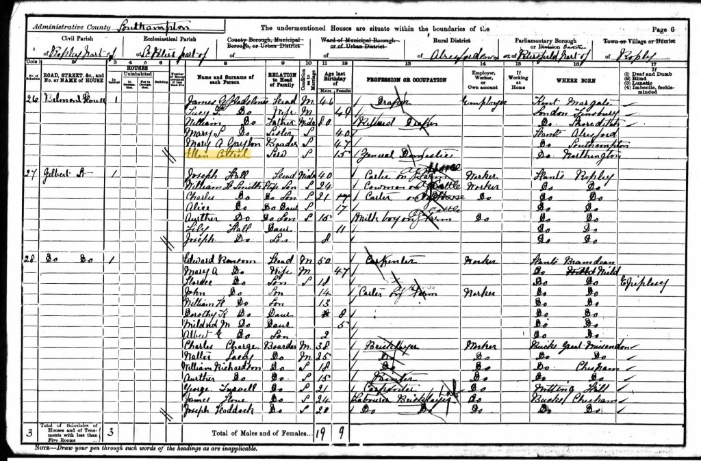 Ellen, aged 15, had moved to Ropley, Hampshire and was working as a general domestic servant for James and Lucy Gladstone at Belmont House.