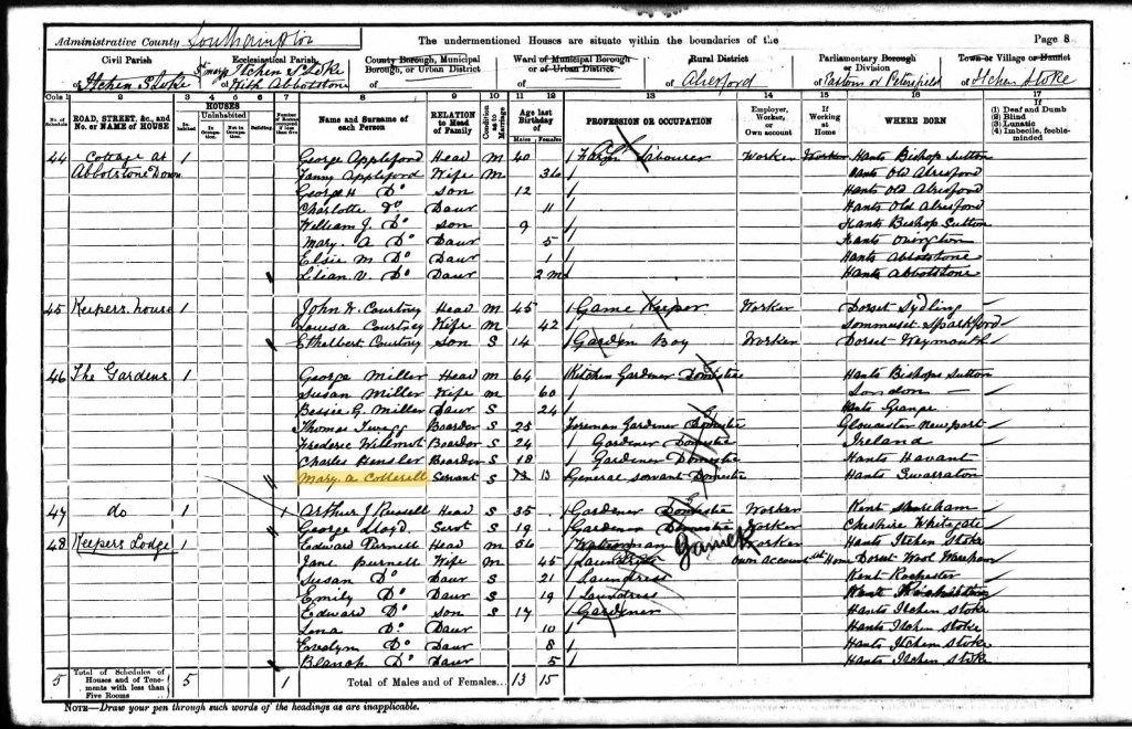 Mary, aged 13, was working as a general domestic servant for George and Susan Miller and their daughter Bessie and three boarders at The Gardens in Itchen Stoke, Hampshire.
