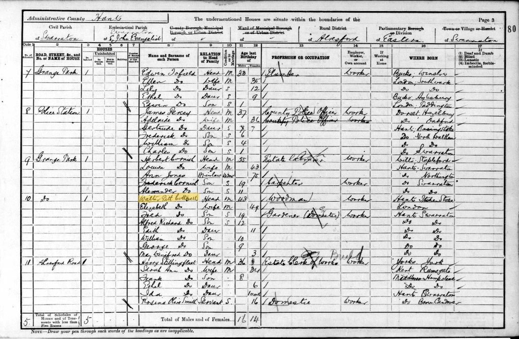 On 5 April 1891, when the next Census was recorded, Walter (aged 33, a woodman) and Elizabeth (aged 38) are living on Alresford Road, within the Grange Park estate. They have seven children at home with them: Fred, aged 9; Walter, aged 8; Lizzie (transcribed as Elizabeth), aged 6; Ellen, aged 5; Mary, aged 3; Alfred, aged 2; and Edith, aged 7 months. The eldest four children are at school.