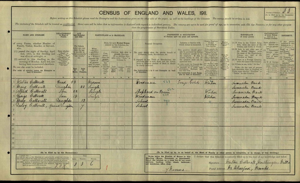 The 1911 Census was taken on 2 April. Walter, now widowed and aged 53, was still a woodman on the Grange Park estate in a house called Northington Villa. Living with him were four of his children and one grandchild: Mary, aged 23; Alfred, aged 22, a shepherd; George, aged 18, a woodman; May, aged 13, at school; and granddaughter Daisy, aged 7, at school. I was not sure who Daisy’s parents are and the GRO records do not give a mother’s maiden name on the summary of her registration. I ordered a copy of Daisy’s birth certificate to find out more. This confirmed that she was born on 19 October 1903 in Swarraton. Her mother was Lizzie Cotterell, Walter and Elizabeth’s fifth child. There was no father recorded so this will remain a mystery. Lizzie herself, is recorded (most likely) as a boarder at an address in Holt, Wiltshire.