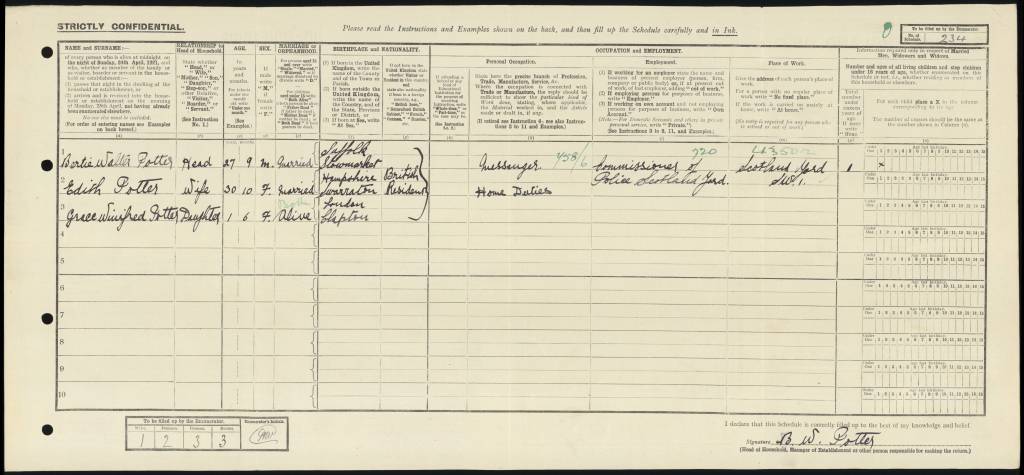 Edith was living with her husband Bertie and their daughter Grace at 95 Willingdon Road in Wood Green, London. Edith was 30 years old, and Bertie, aged 27, was working as a messenger for the Commissioner of Police at Scotland Yard. Grace was 18 months old.