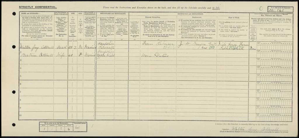 Walter Guy and his wife Beatrice were still living at Mile House Cottages in Sulhamstead, Berkshire. Walter’s date of birth was recorded as 5 November 1882, and his occupation as a general farm worker. Beatrice’s date of birth was 4 June 1876.