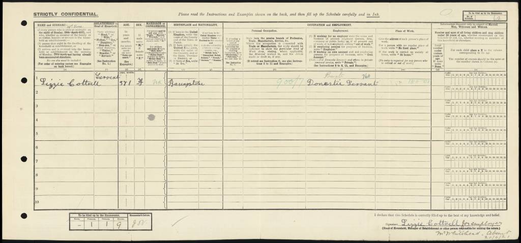 I believe Lizzie, aged 37, was a domestic servant at 513 Romford Road in East Ham, London. She was the only person listed on the return, though the address page does refer to the occupier as Whitehead. I have not been able to find any trace of any other returns for this address unfortunately.