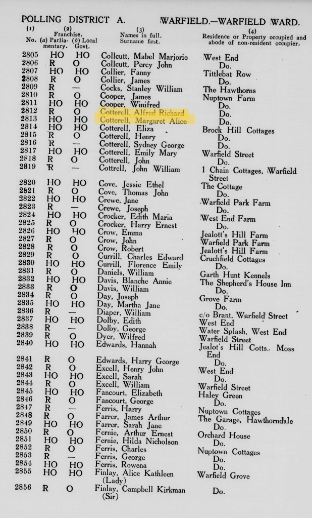 Alfred, and his wife Margaret and their two daughters, are another family I have not been able to trace on the 1921 Census. There are electoral records for this period showing that Alfred and Margaret were living at Nuptown Farm in Bracknell, Berkshire. It is a prestigious address and I assume that Alfred worked there as a shepherd or similar, and the family lived in a cottage on the estate of over 6 acres.