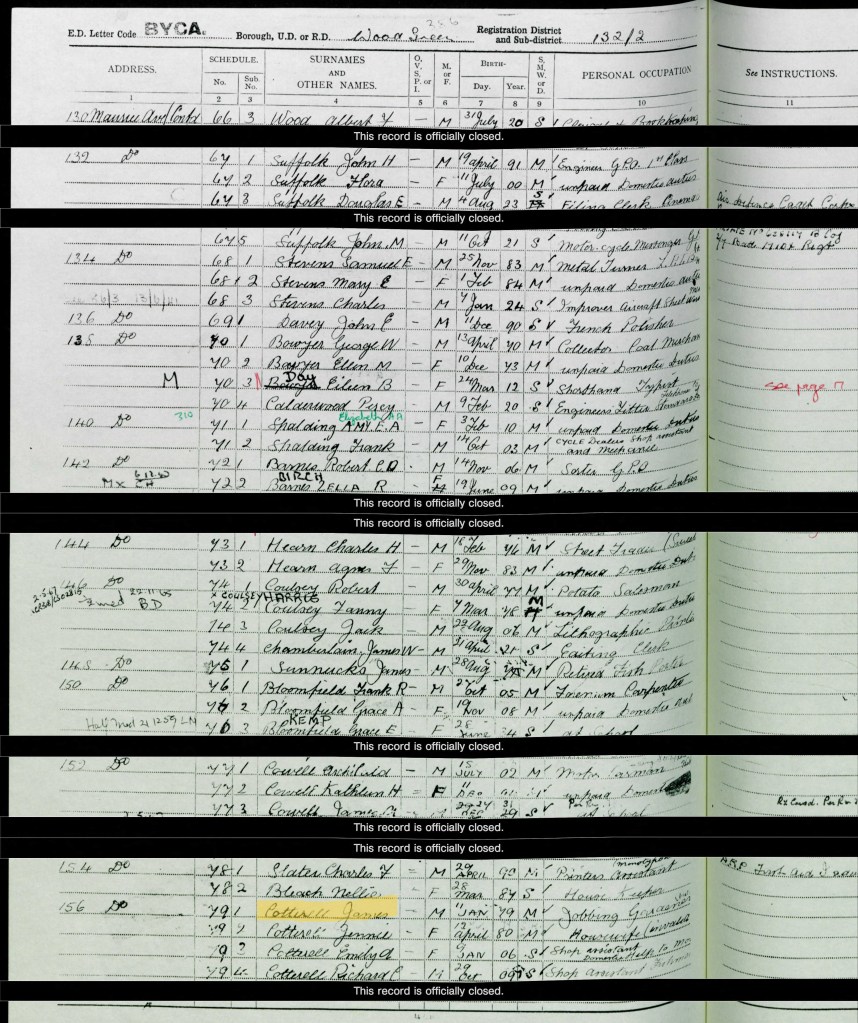 The 1939 Register, taken on 29 September, records James and his family in Wood Green, London, as they were for the 1921 Census. One record remains closed. My original assumption was that this record would be for John, their youngest son. However, I believe he married Ethel Ada Turner the year prior to the Register being taken, in Edmonton. Ethel was born in 1911 in Edmonton. I’m not sure if they had children; FreeBMD lists eight Cotterell’s born between 1943-1958, with a mother’s maiden name Turner. Without ordering a birth certificate for each, it is not possible to confirm if their parents were John and Ethel.