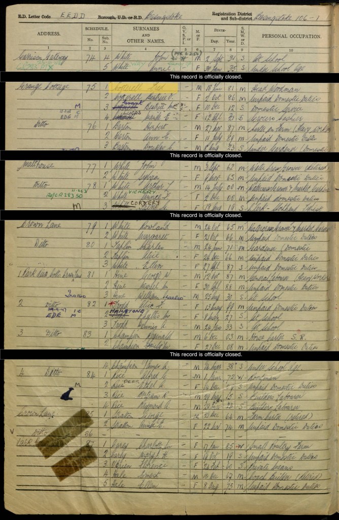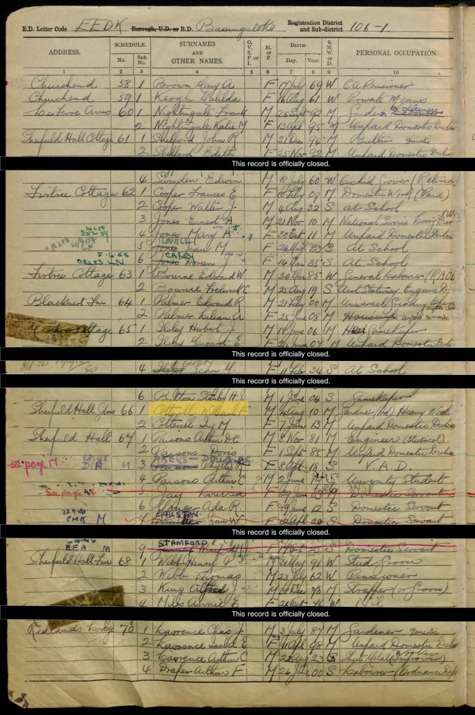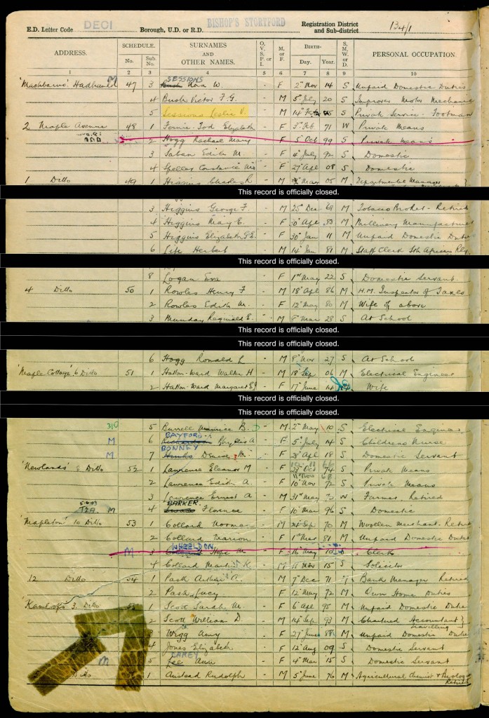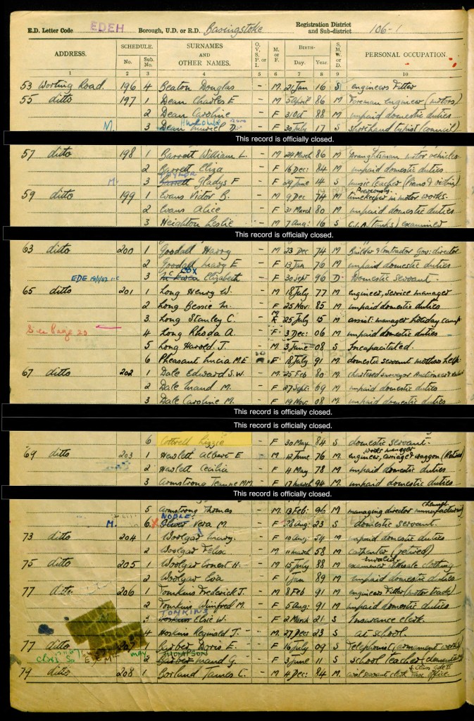 Fred and his wife Beatrice were living with two of their daughters at Grange Cottage in Old Basing, Hampshire. Fred’s date of birth is recorded as 18 June 1881 and he was head woodman; Beatrice was born on 2 October 1886. Their eldest daughter, Beatrice, was born on 10 December 1912, and their youngest daughter Maud (spelt Maude on the Register) was born on 12 April 1921. Beatrice (junior) was working in domestic service, and Maud was a grocer’s cashier.