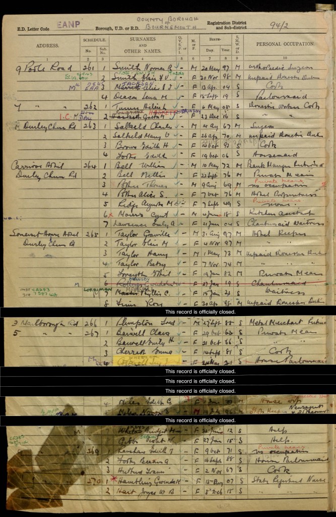 Alfred and Margaret’s second daughter Ivy was living in Bournemouth, Hampshire and working as a house parlourmaid. Her date of birth was 24 March 1921. The Register records that she later married and became Ivy Wheeler.